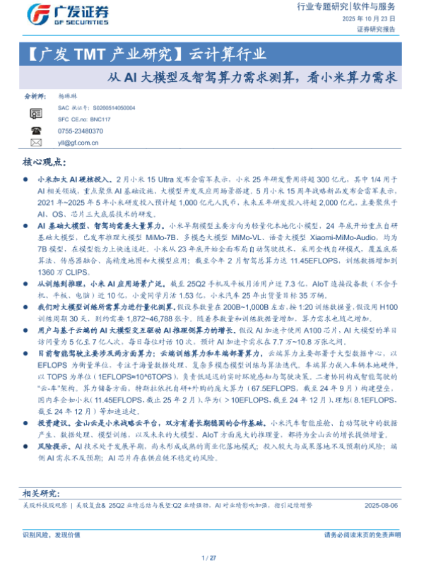 算力需求 智能驾驶 AI大模型 小米 云计算