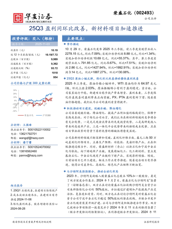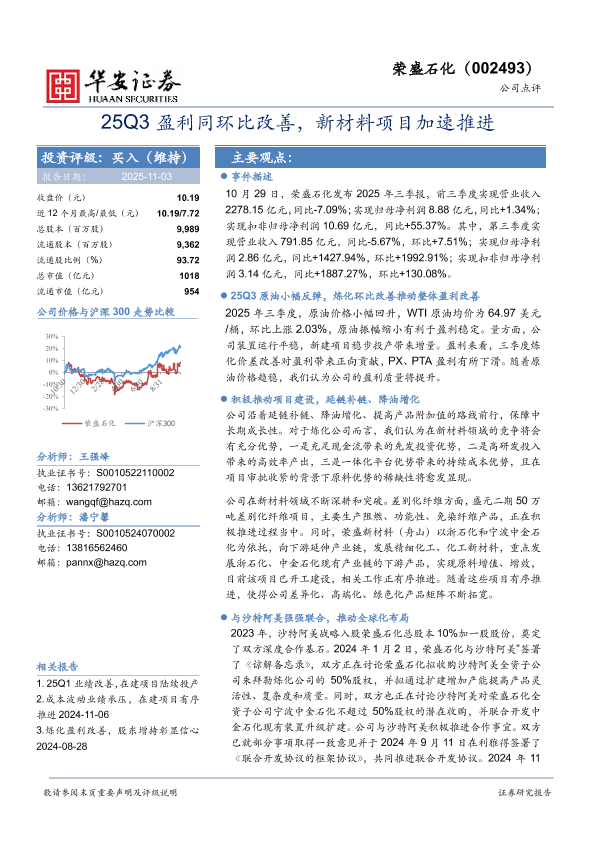 【华安证券】【2025】25Q3盈利同环比改善,新材料项目加速推进-4页