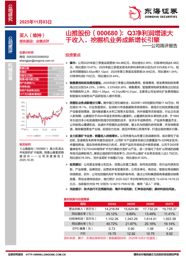 【东海证券】【202511】山推股份(000680):Q3净利润增速大于收入,挖掘机业务成新增长引擎-3页