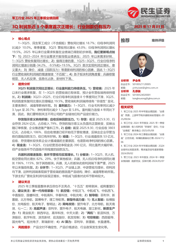 【民生证券】【202511】军工行业2025年三季报业绩回顾:3Q利润系近9个季度首次正增长;行业回款仍有压力-18页