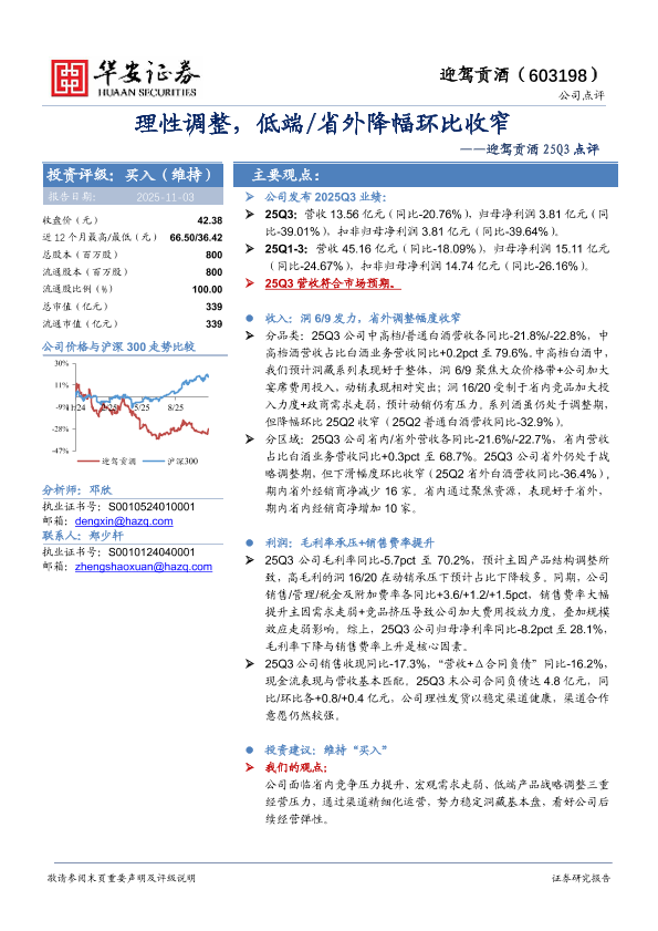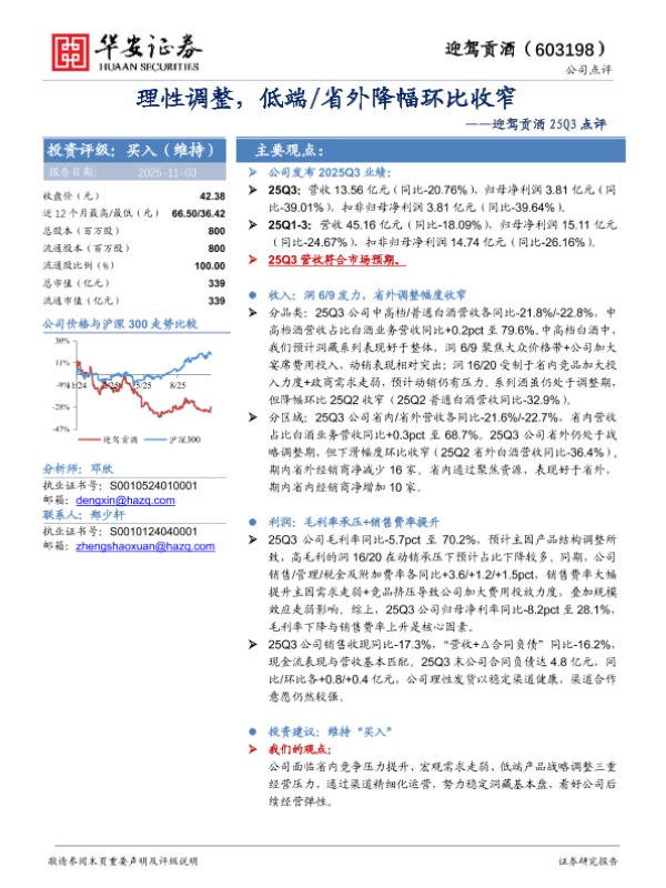 【华安证券】【202511】迎驾贡酒 25Q3点评:理性调整,低端/省外降幅环比收窄-4页