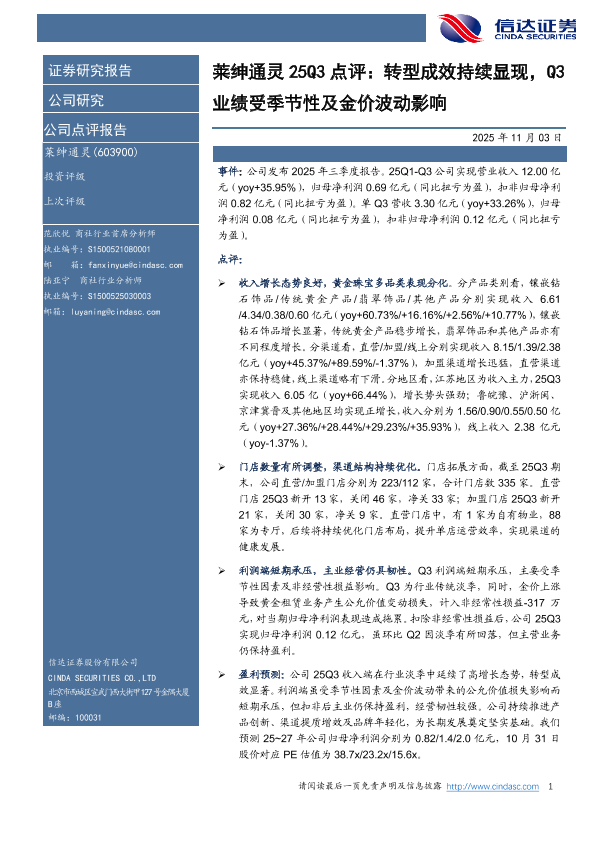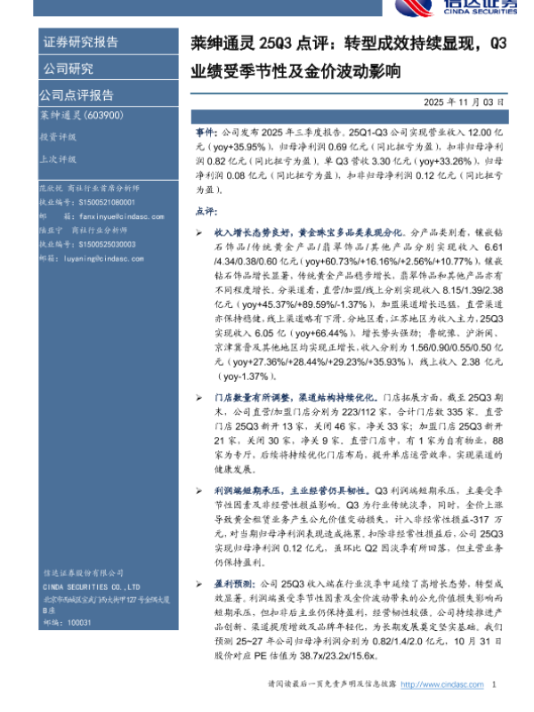 【信达证券】【202511】莱绅通灵25Q3点评:转型成效持续显现,Q3业绩受季节性及金价波动影响-5页