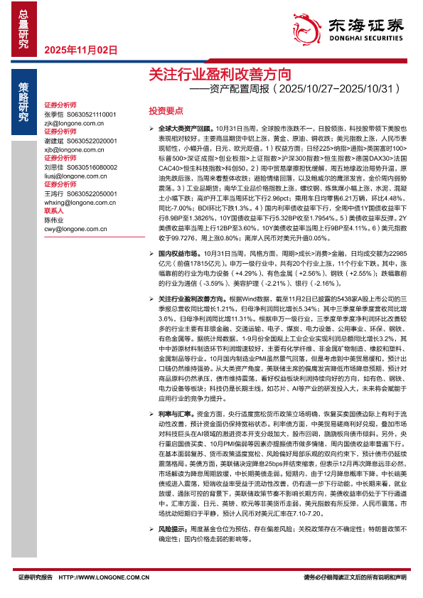 【东海证券】【202511】关注行业盈利改善方向——资产配置周报(2025/10/27-2025/10/31)-27页