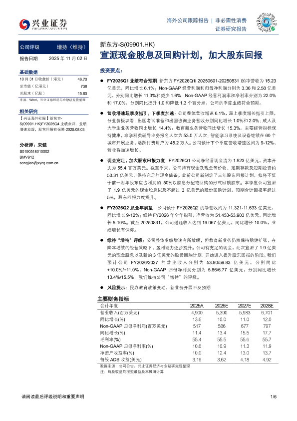 S公司 现金股息 股份回购 股东回报 新东方