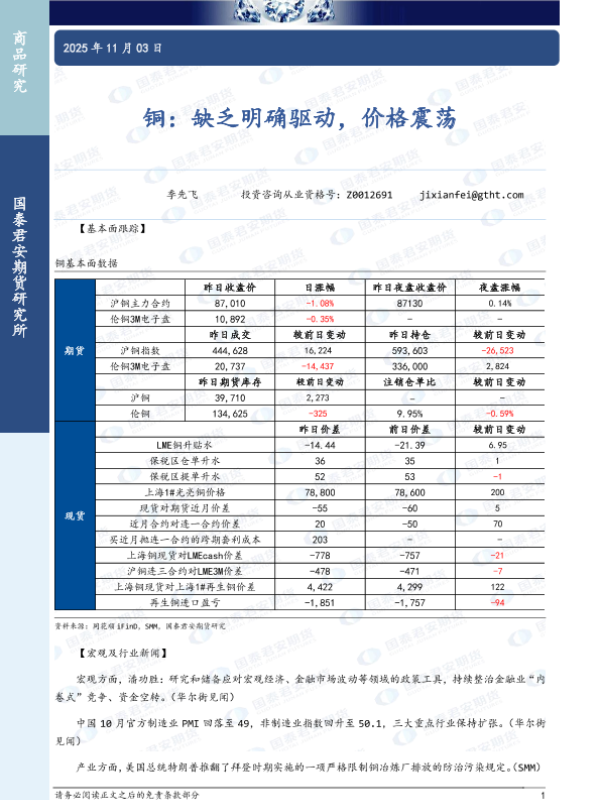【国泰君安期货】【202511】铜:缺乏明确驱动,价格震荡-3页