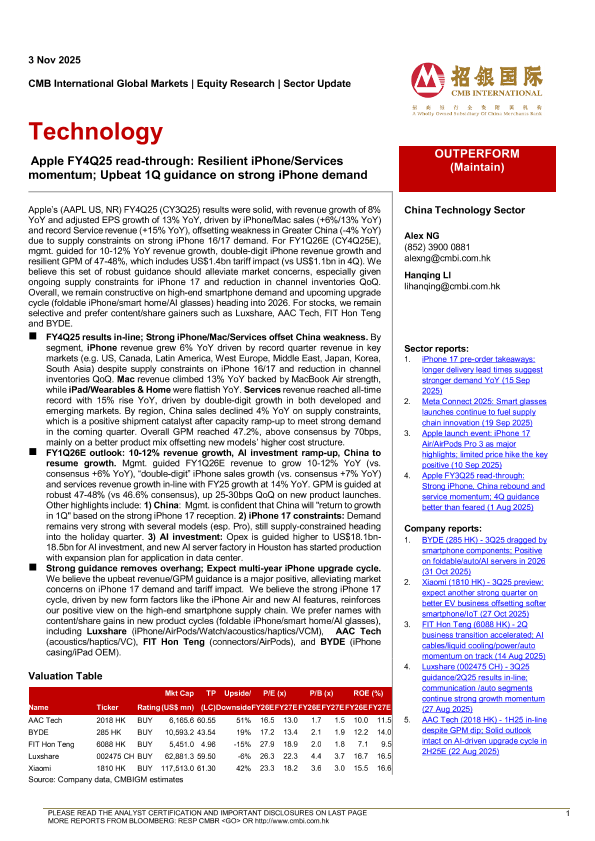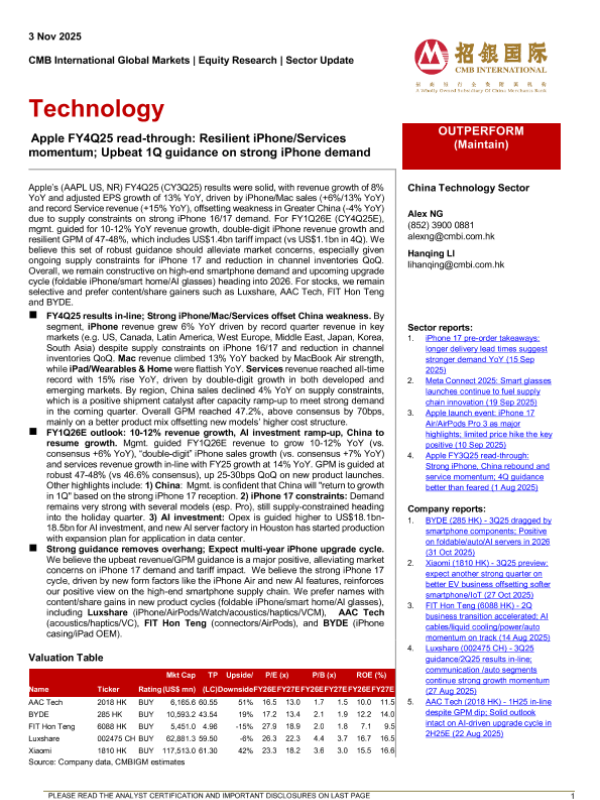 【CMB International Global Markets】【202511】Technology- Apple FY4Q25 read-through Resilient iPhone/Services momentum; Upbeat 1Q guidance on strong iPhone demand-4页