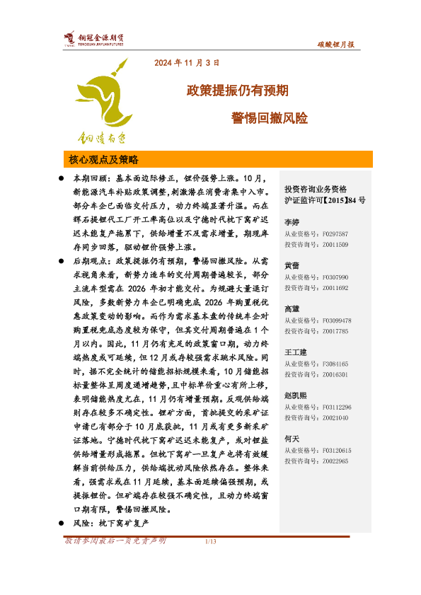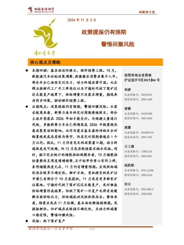 【铜冠金源期货】【202411】碳酸锂月报_政策提振仍有预期_警惕回撤风险-13页