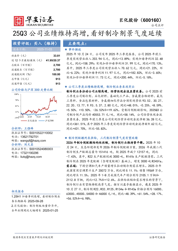 【华安证券】【202511】25Q3公司业绩维持高增,看好制冷剂景气度延续-4页