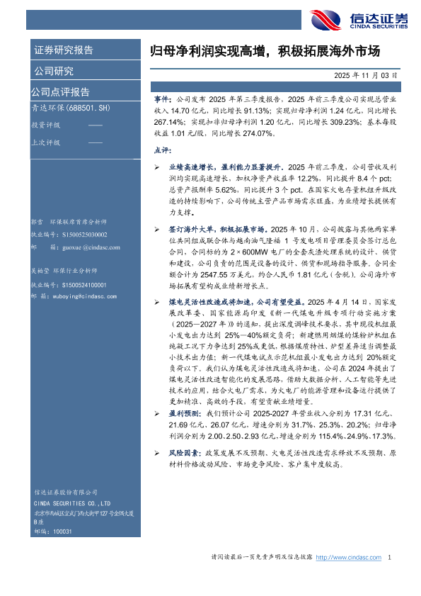 环保 煤电改造 业绩增长 海外市场 盈利预测