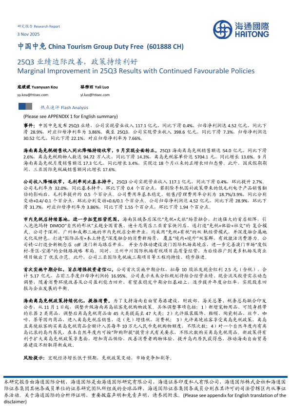 【海通国际】【202511】25Q3业绩边际改善,政策持续利好-9页