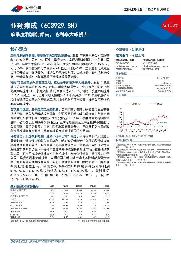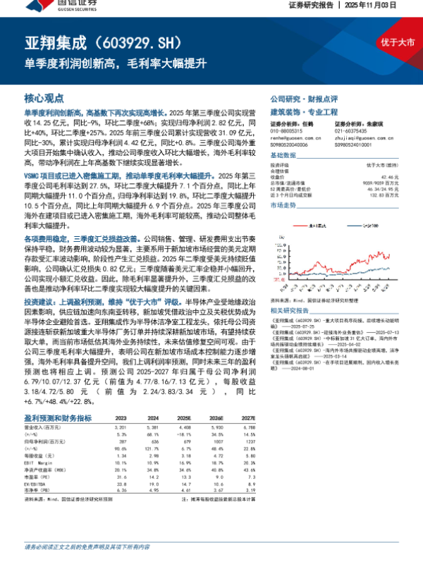 半导体工程 毛利率提升 海外业务 盈利预测 建筑装饰