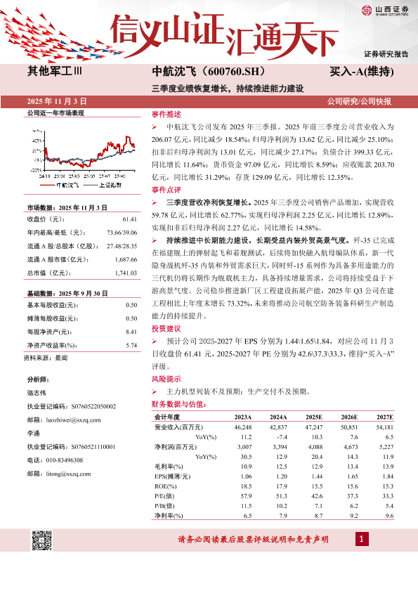 【山西证券】【202511】中航沈飞(600760.SH) 买入-A(维持) 三季度业绩恢复增长,持续推进能力建设-5页
