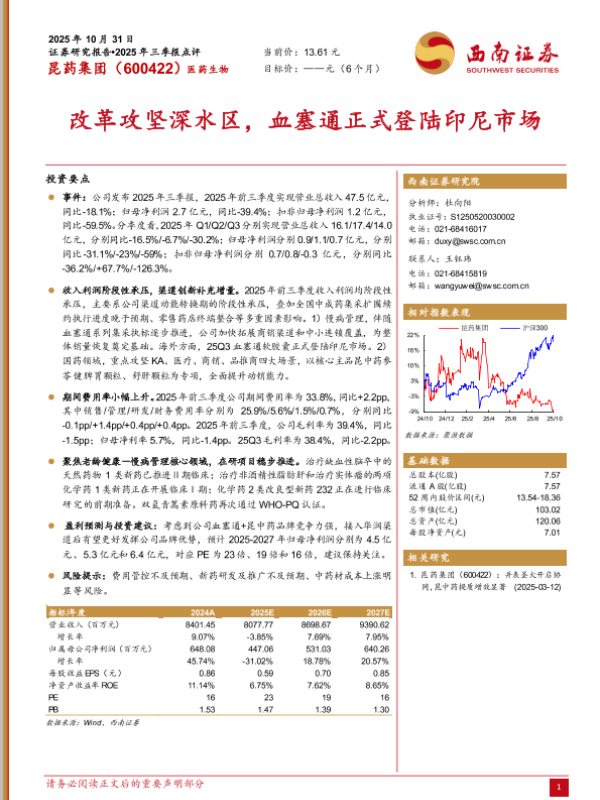 昆药集团 三季报点评 血塞通 印尼市场 医药生物