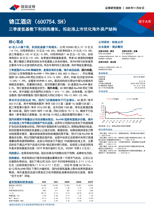 酒店行业 利润增长 财报点评 海外资产优化 港股上市