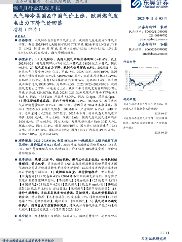 【东吴证券】【202511】燃气Ⅱ行业跟踪周报·天气转冷美国&中国气价上涨,欧洲燃气发电出力下降气价回落-14页