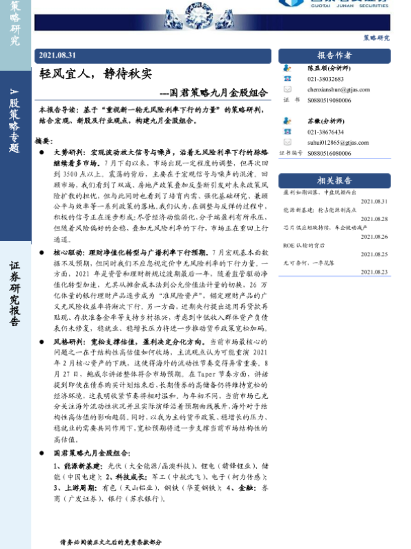 【国泰君安证券】【20210831】国君策略九月金股组合:轻风宜人,静待秋实-17页