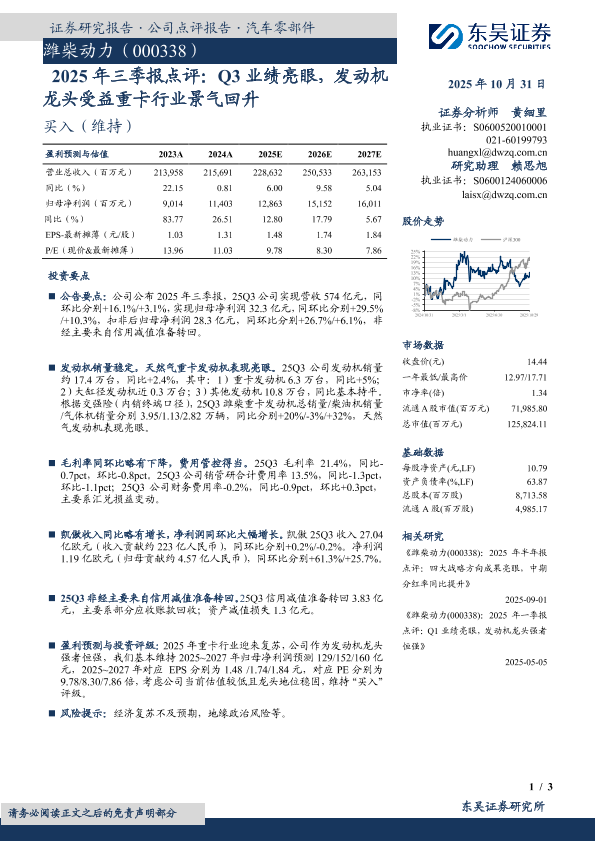 【东吴证券】【202510】2025年三季报点评:Q3业绩亮眼,发动机龙头受益重卡行业景气回升-3页