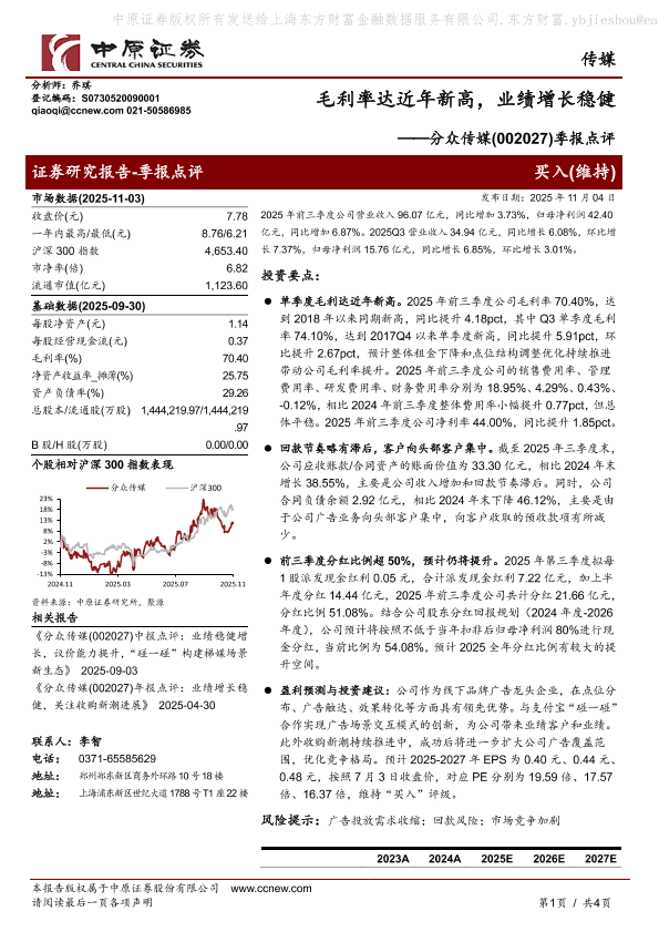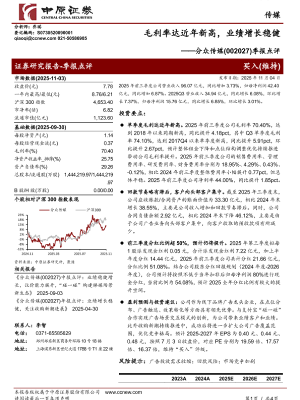 【中原证券】【202511】毛利率达近年新高,业绩增长稳健——分众传媒(002027)季报点评-4页