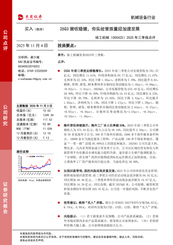 现金流管理 徐工机械 三季报点评 营收增长 海外拓展