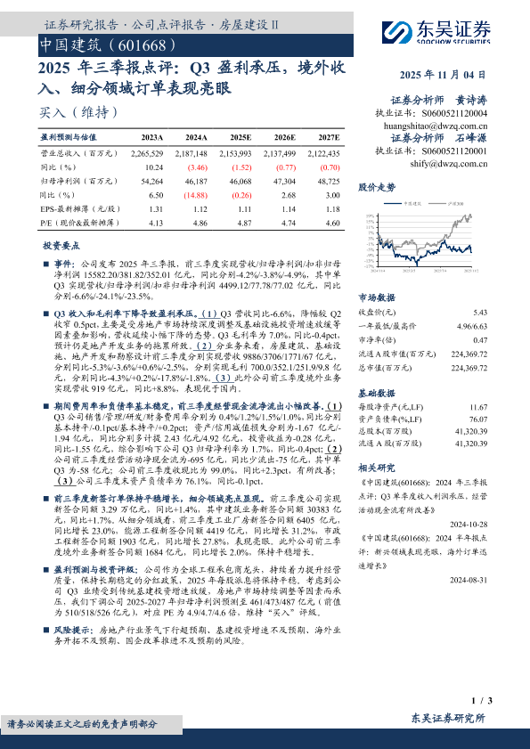 境外收入增长 三季报点评 细分领域订单 建筑行业 Q3盈利承压
