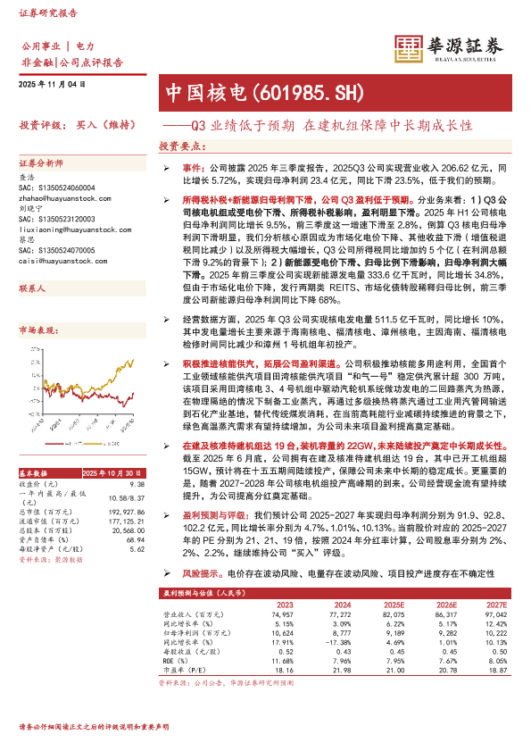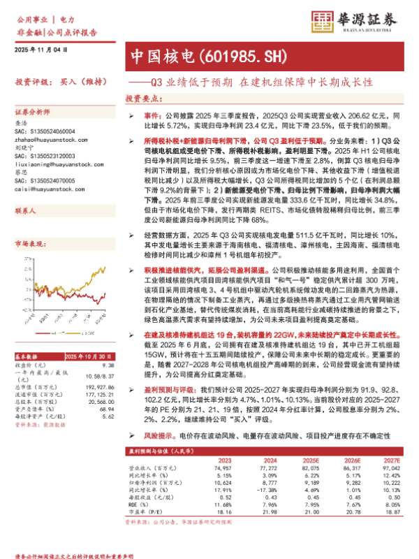 【华源证券】【202511】中国核电(601985.SH)——Q3业绩低于预期在建机组保障中长期成长性-3页