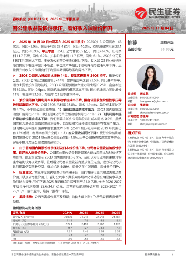 【民生证券】【202511】2025年三季报点评:客公里收益阶段性承压,看好收入端量价回升-3页