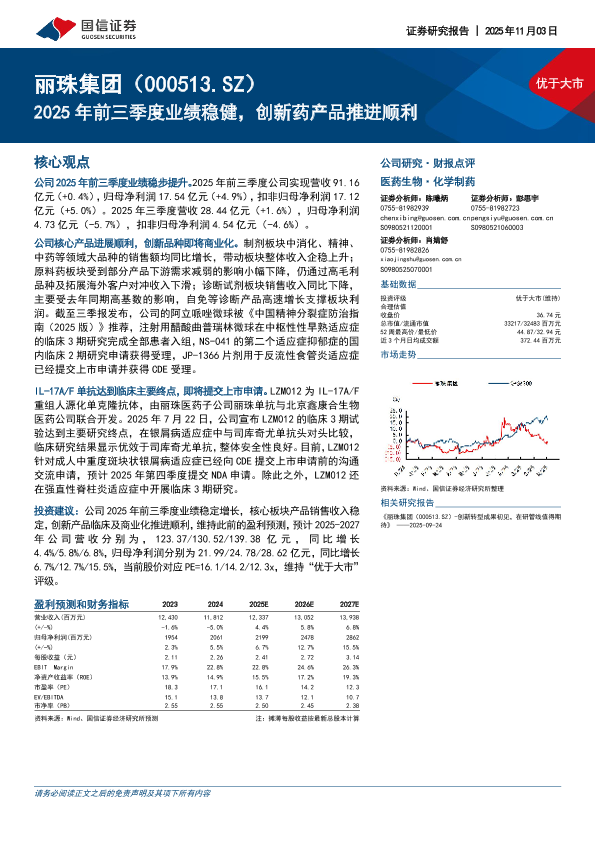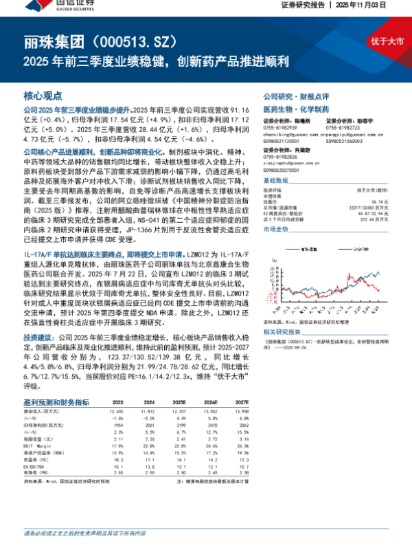投资评级 财报点评 丽珠集团 创新药 医药生物