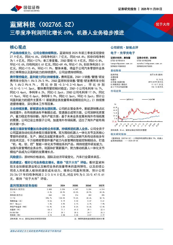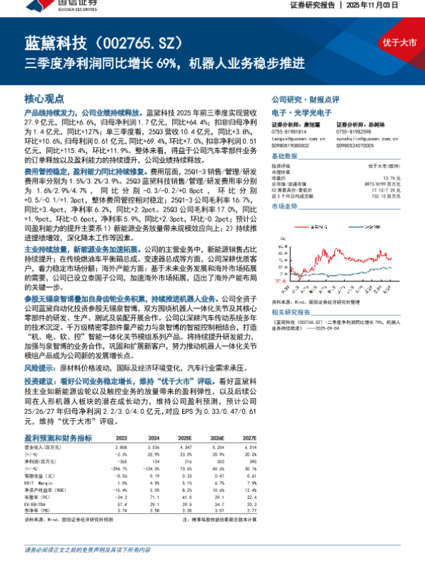 【国信证券】【202511】优于大市 蓝黛科技(002765.SZ)三季度净利润同比增长 69%,机器人业务稳步推进-6页