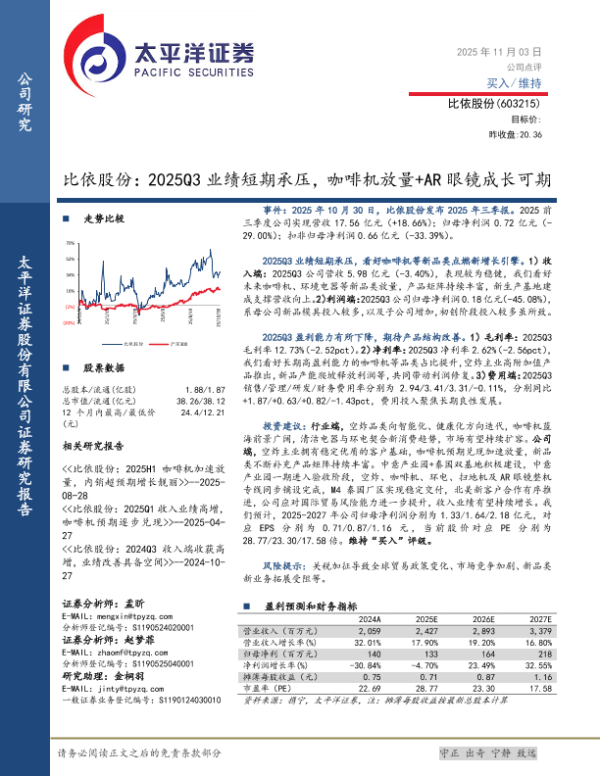 【太平洋证券】【202511】比依股份:2025Q3业绩短期承压,咖啡机放量+AR眼镜成长可期-4页