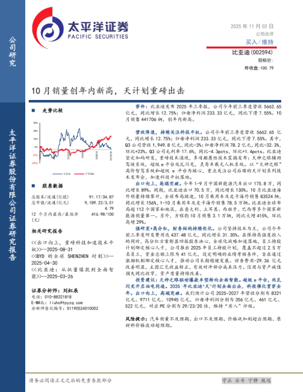 投资评级 技术研发 销量增长 比亚迪 出口扩张