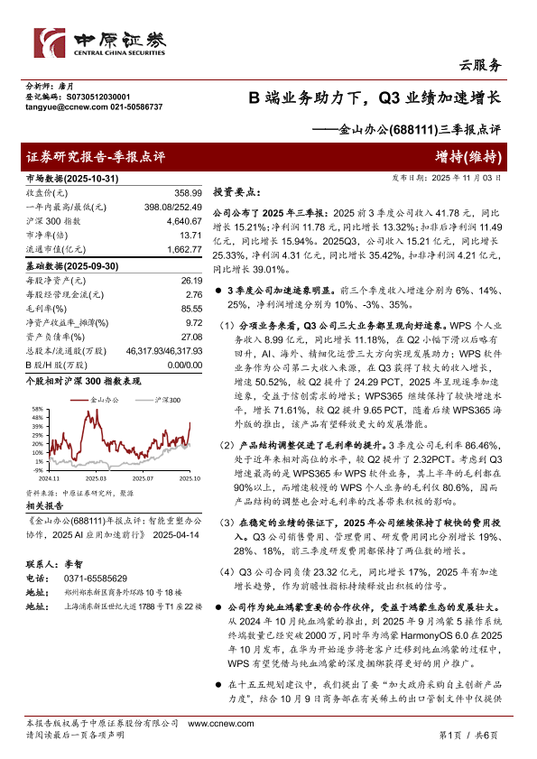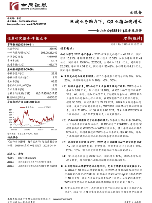 【中原证券】【202511】B端业务助力下,Q3业绩加速增长——金山办公(688111)三季报点评-6页