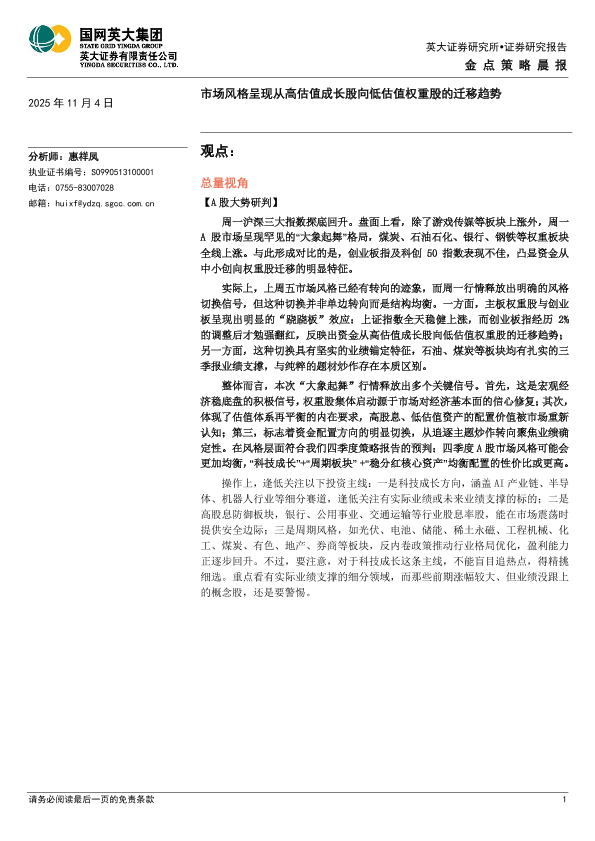 【英大证券】【202511】金点策略晨报:市场风格呈现从高估值成长股向低估值权重股的迁移趋势-4页
