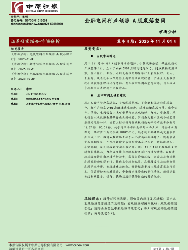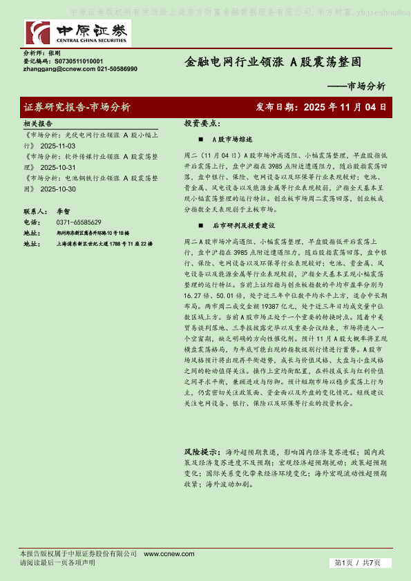 【中原证券】【202511】市场分析:金融电网行业领涨 A股震荡整固-7页
