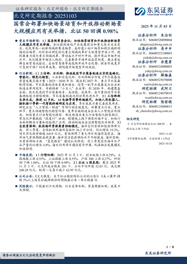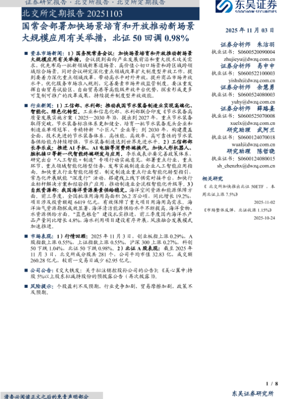 【东吴证券】【202511】国常会部署加快场景培育和开放推动新场景大规模应用有关举措,北证50回调0.98%-8页