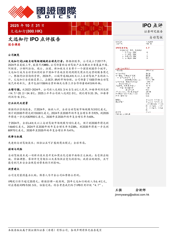自动驾驶 技术风险 IPO点评 L4级自动驾驶 全球布局