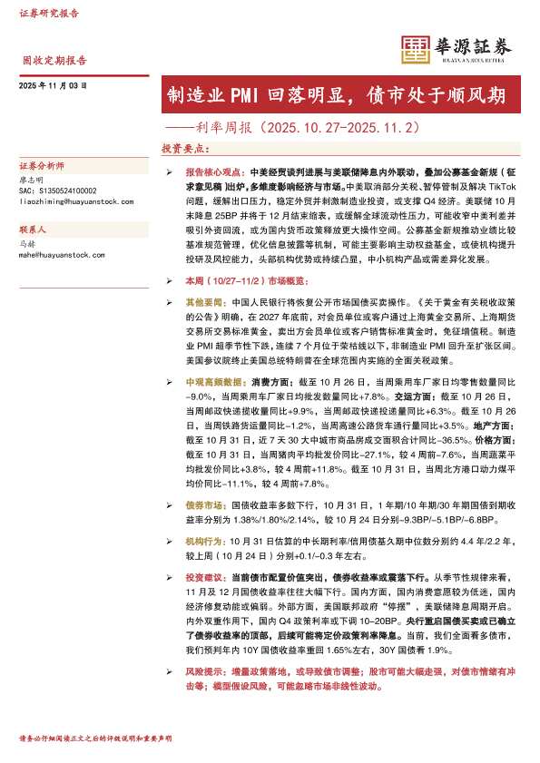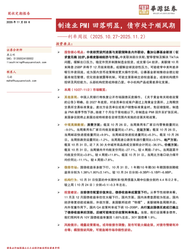 【华源证券】【202511】制造业 PM I回落明显,债市处于顺风期——利率周报(2025.10.27-2025.11.2)-18页