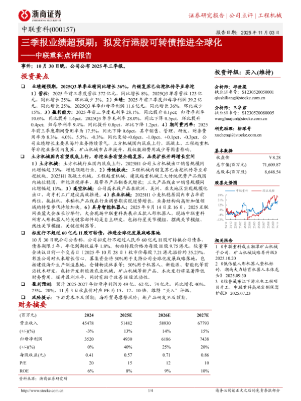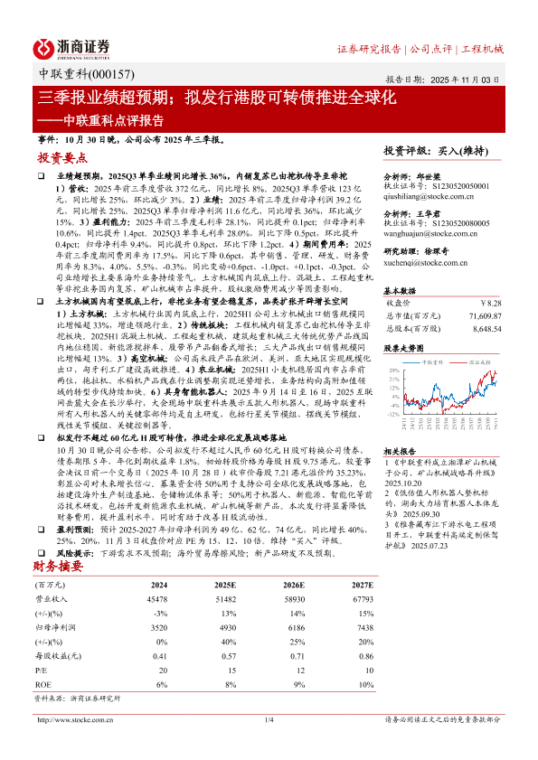 【浙商证券】【202511】中联重科点评报告——三季报业绩超预期;拟发行港股可转债推进全球化-4页