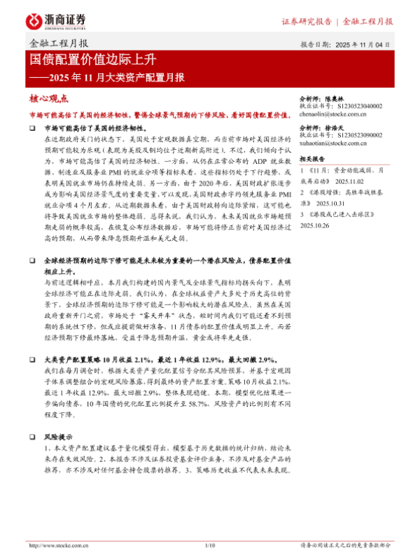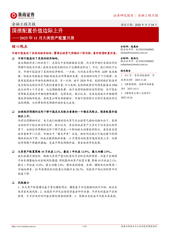 【浙商证券】【202511】国债配置价值边际上升——2025年11月大类资产配置月报-10页