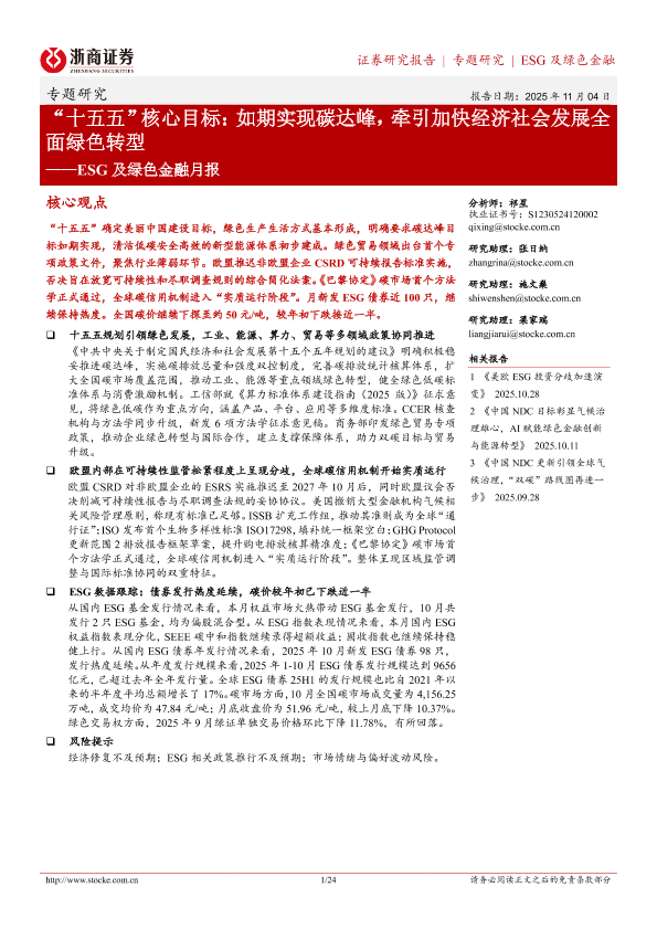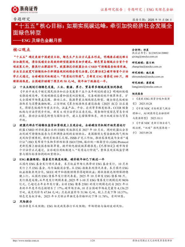 【浙商证券】【202511】“十五五”核心目标:如期实现碳达峰,牵引加快经济社会发展全面绿色转型——ESG及绿色金融月报-24页