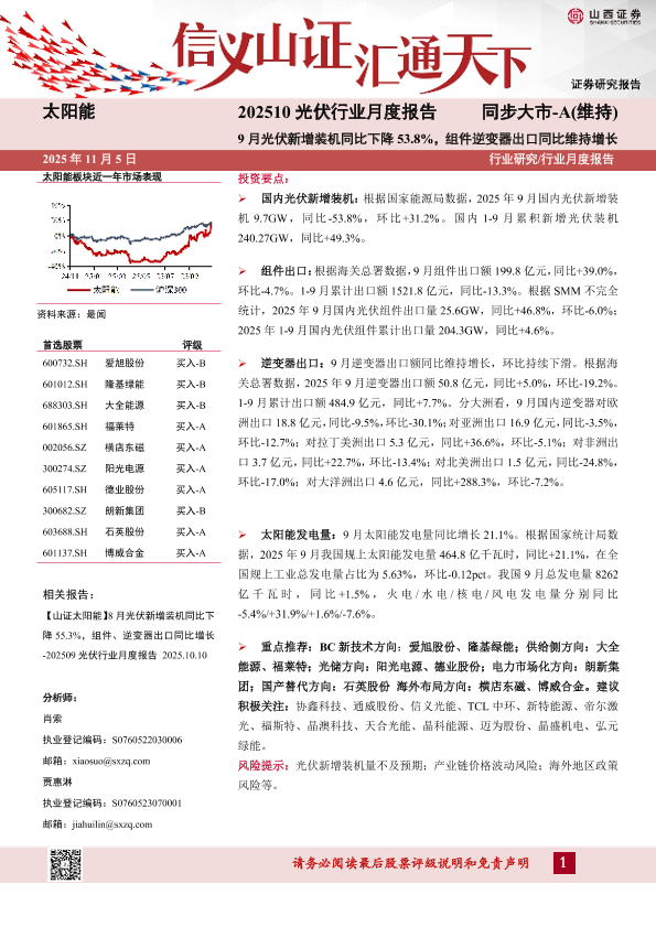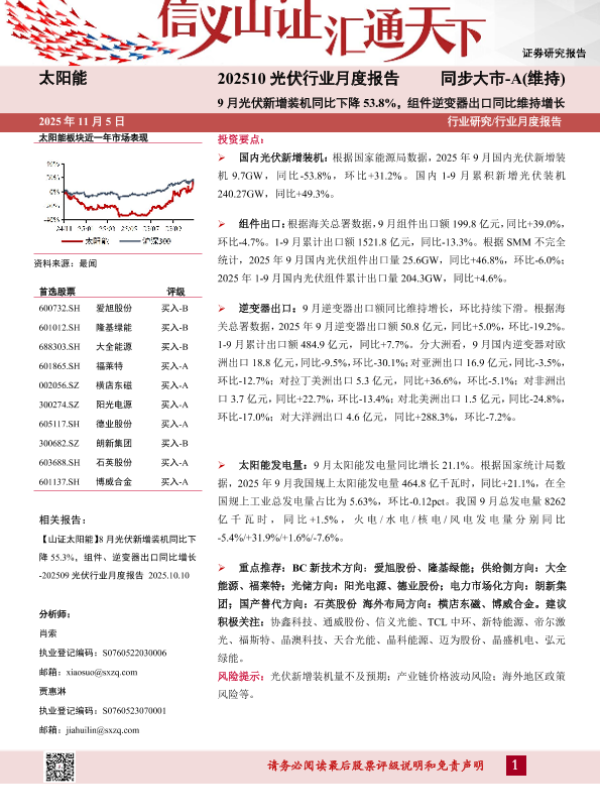 【山西证券】【202510】202510光伏行业月度报告:9月光伏新增装机同比下降53.8%,组件逆变器出口同比维持增长-11页