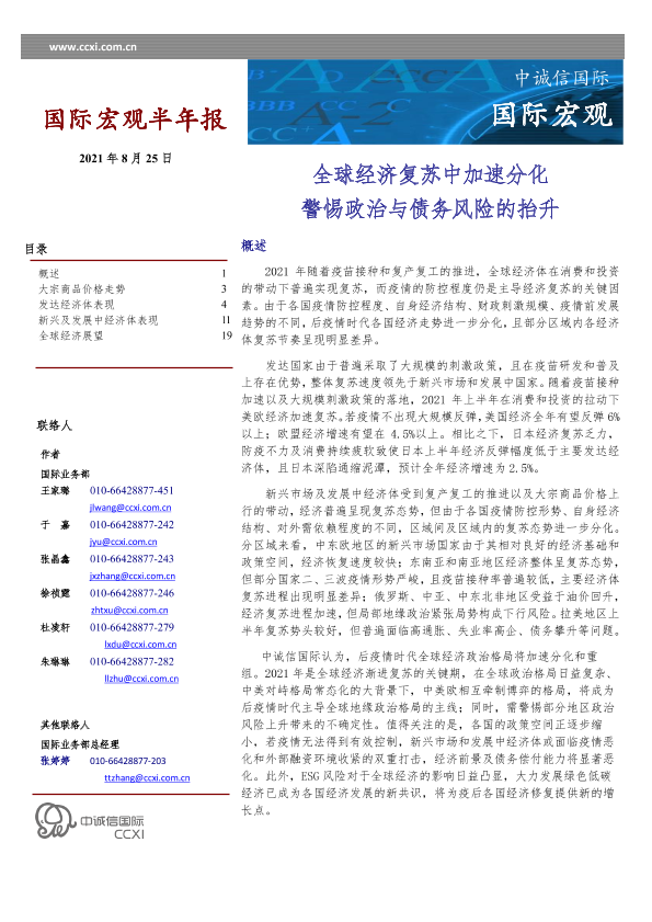 【中诚信国际】【20210825】国际宏观半年报:全球经济复苏中加速分化,警惕政治与债务风险的抬升-19页