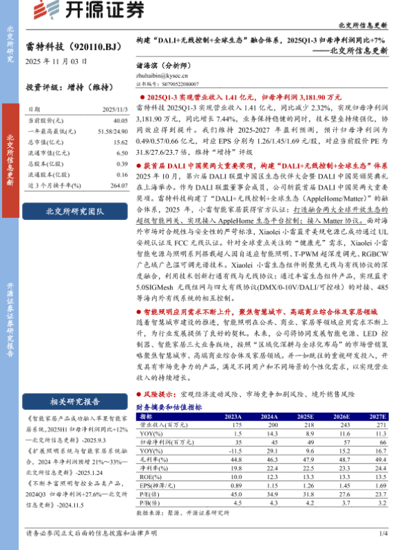 【开源证券】【202509】构建“DALI+无线控制+全球生态”融合体系,2025Q1-3归母净利润同比+7%-4页