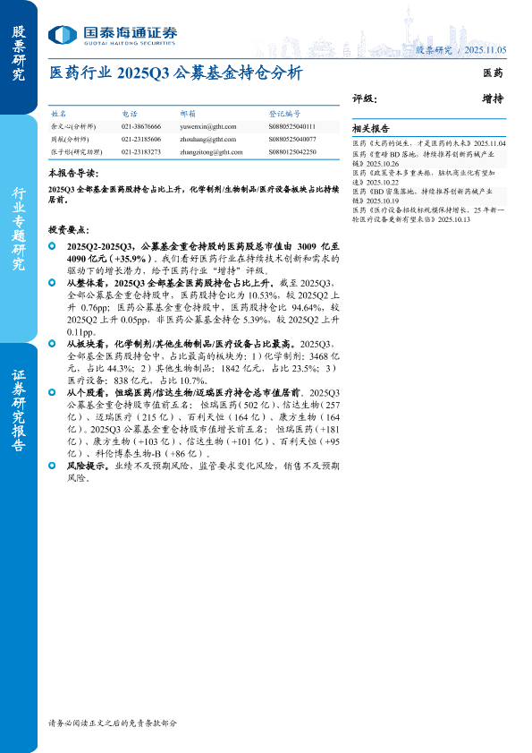 【国泰海通证券】【202511】医药行业2025Q3公募基金持仓分析-8页