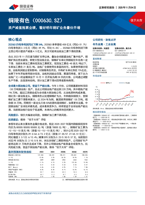 投资评级 资产减值 加工费下滑 冶炼产能 铜业