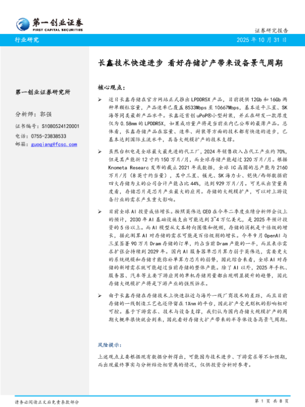【第一创业证券】【202510】长鑫技术快速进步看好存储扩产带来设备景气周期-8页