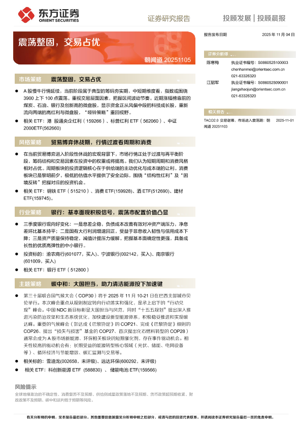 交易策略 震荡整固 ETF投资 碳中和 银行板块