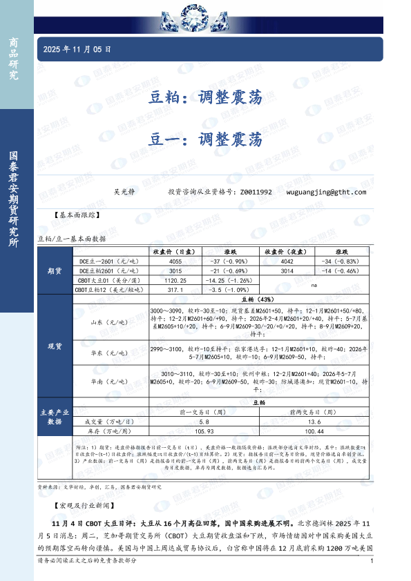 【国泰君安期货】【202511】豆粕:调整震荡, 豆一:调整震荡-3页