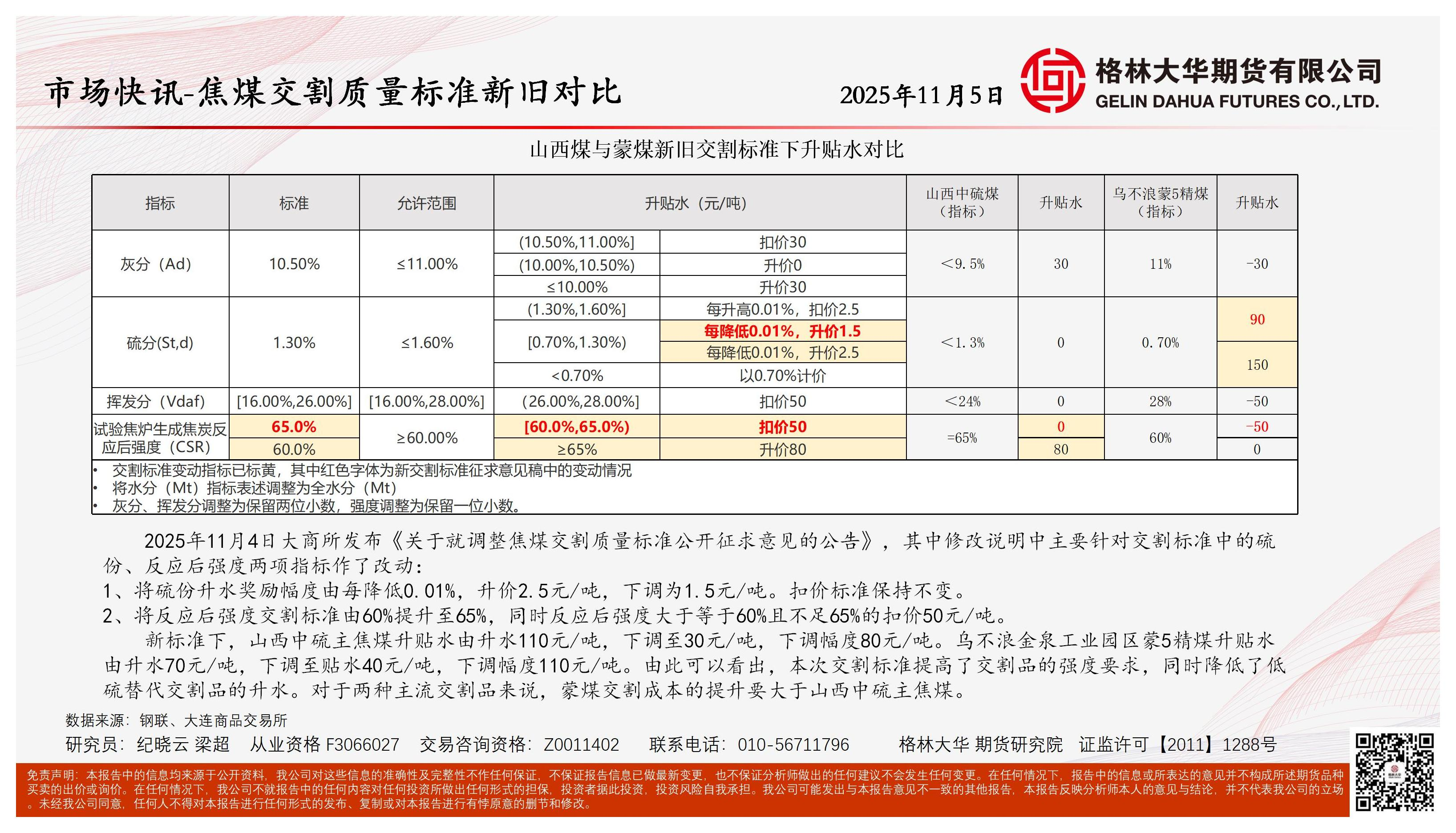 【品格林大华期货有限公司】【202511】市场快讯-焦煤交割质量标准新旧对比-1页