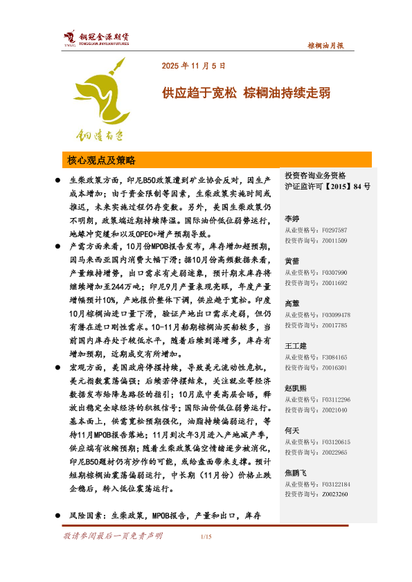 【铜冠金源期货】【202511】供应趋于宽松棕榈油持续走弱-15页