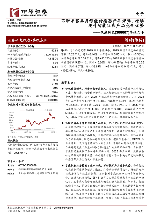 【中原证券】【202511】不断丰富具身智能传感器产品矩阵,持续提升智能仪表产品竞争优势——汉威科技(300007)季报点评-5页